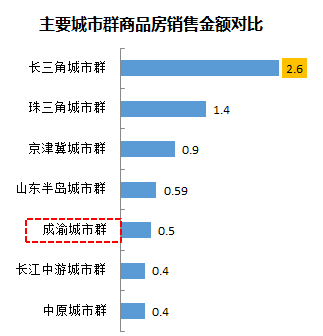 而从商品房销售金额对比来看,成渝城市群与长三角、珠三角两个城市群相比差距非常大,仅占长三角的1/5,房地产市场成熟度较低。