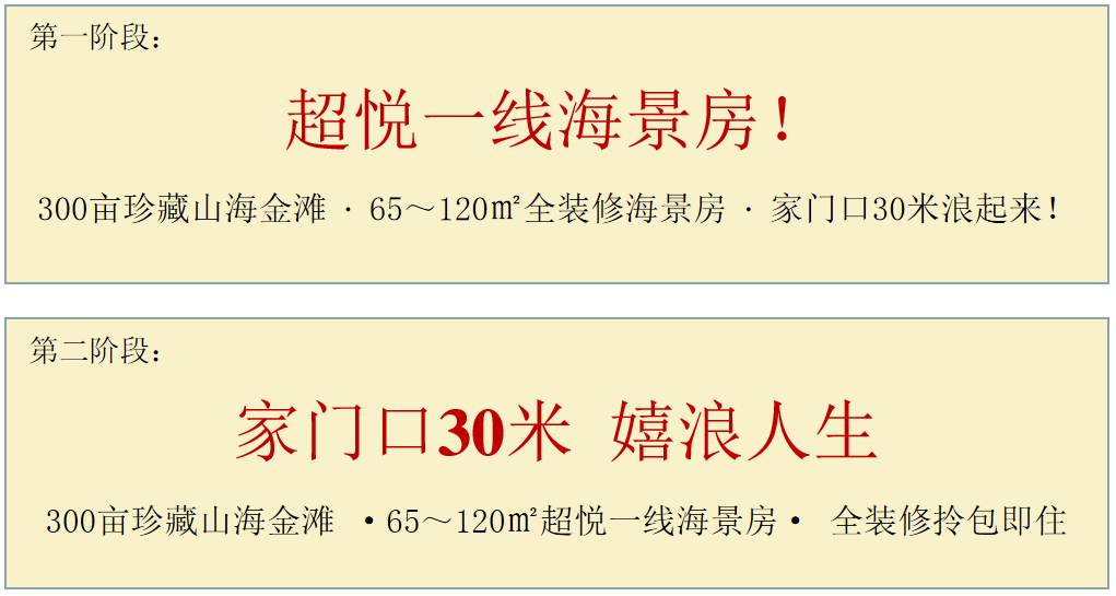 例如:某超一线头排海景地产项目,形象期的推广主题原计划为“全国人民一起来碰海”。进一步分析后发现当地置业客群外地人占比80%以上,且其中大部分源于北方候鸟旅居及短期旅游客源,其购买行为具有一定的随机性和即时性。所以,建议“形象期”即“抢客期”,更直观地呈现产品核心卖点“近海”。基于这个思路,推广内容与推广节奏可以参考如下方案(见图5-33)。