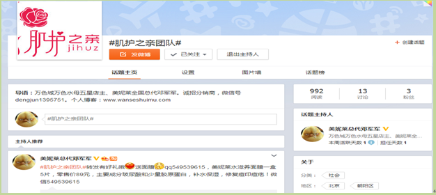 5)利用微话题吸粉。通过微博创建微话题,每次在发微博的时候,可以在关键词前后增加“##”,比如“#肌护之亲团队#”,那么“肌护之亲团队”就是一个微话题,你就是这个微话题的主持人,可以管理这个话题,并且可以设置正反观点让话题观众进行投票。此外,还可以设置转发有礼活动。这样别人在发布“肌护之亲团队”这个关键词的时候就会第一时间进入你的微话题,那么你的信息和联系方式也会第一时间展示在对方面前,从而达到极高曝光率和吸粉的作用。