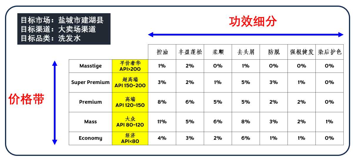 “将建湖县大卖场渠道洗发水品类的整体生意设定为100%,从价格带和功效细分两个维度来拆解生意组成。通过数据不难发现大众和高端的价格带是这个渠道的前两大消费价格区间,而控油、丰盈蓬松、柔顺和去头屑是该渠道消费者的前四大需求细分,通过两个维度的交叉并把超过5%及以上生意贡献的细分类目找出来,这样我们就能清晰地识别出这个渠道的主要品类细分在哪里,哪里就是我们今后该渠道生意发展的重点工作方向!”老王的语速越来越快,显然已经进入了状态……如图4-10所示。