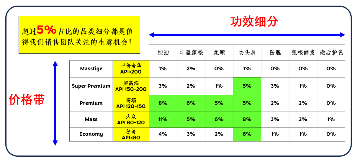 “王总,超过5%生意占比的洗发水细分类目一共有10个,这10个又同时涉及四个价格带和四个功效带,我想如果同时聚焦10个工作重点,那不就没有重点了吗?”小王疑惑地问道。