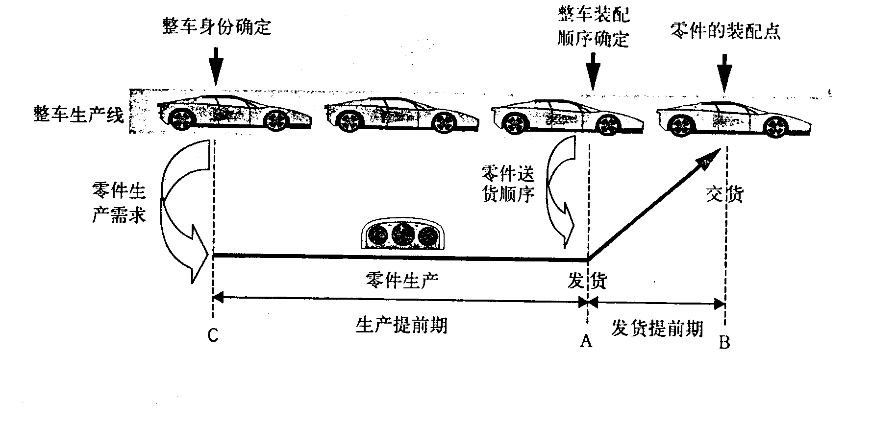 整个生产和供应过程如图所示,当车身通过整车身份确定点(图中C点),该车身被赋予一个具体的生产订单,它的零件构成和下线时间也就确定下来,这时将零件的需求信息传递给相应的供应商,供应商即可组织生产零件。整车身份确定点通常设在焊接车间车身形成(合装)处。整车经过涂装车间进入总装车间时,需按照各整车品种均衡生产的规则确定装配顺序,并将该顺序信息转化成零件交货顺序传递给供应商,供应商按照此顺序合预定的时间将零件送到工位,实现同步供货。