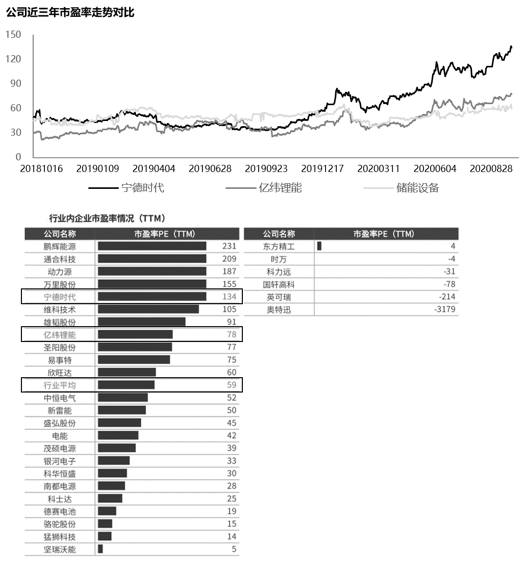 以宁德时代为例,近三年,整个储能行业市盈率水平一直保持平稳,但从2019Q4开始宁德时代与亿纬锂能两家公司市盈率水平开始拉升,说明市场对行业整体表现看好度一般,但认为外部环境的变化高度利好龙头公司;宁德时代目前市盈率水平已经远高于行业和亿纬锂能,说明资金已经将股价推到了一个较高的预期位,未来业绩兑现程度将极大影响公司的股价的未来走势。如图7-2所示。