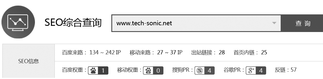 第一家企业网站每天有200个左右IP来自百度的访问,移动来路30个IP左右,出站链接28个,反链57个,整整多了一倍,对首页的内链只有25个,偏少。百度权重为1,移动权重为0(因为它们到现在为止还没有移动端网站),搜狗和谷歌权重都为4,在企业网站中算是权重高的。