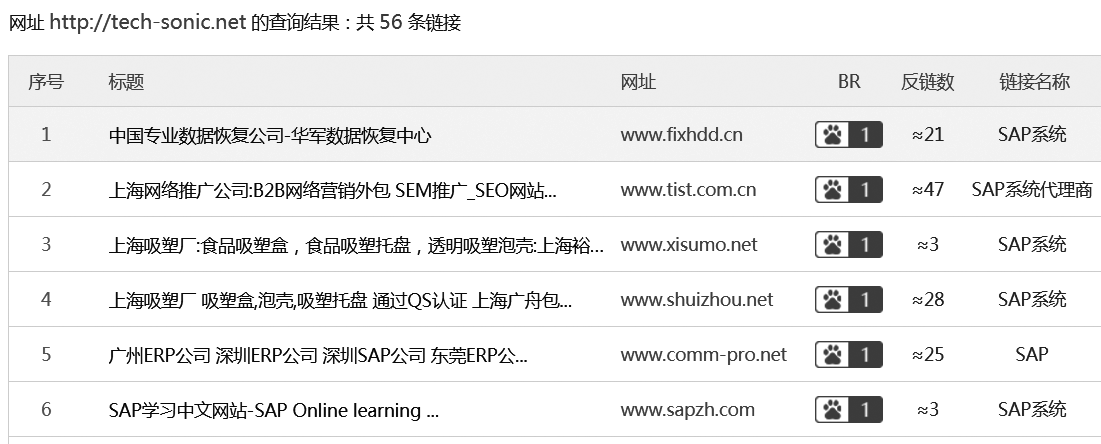 友链也要适度,企业网站首页最多做20~30条友情链接,再多就可以考虑自己重要的子页面与别人的子页面相互链接,简称为子链。子链不需要太多,一个页面有几个就行。一些大型门户网站的子页面会被设置成二级域名,来和企业的首页进行友链,虽然不公平,但考虑到大网站的大流量,更考虑到这些门户网站被百度收录的频率高(一般企业网站被百度收录的频率为几天甚至几个月一次,而大型门户网站的频率为几小时甚至几分钟一次),有利于企业网站新文章的收录,我们还是很乐意用首页交换其权重低的子页面。图4-20是刚才检测一家企业网站(www.tech-sonic.net)友链,排名在第32位的今题网宁波分站,尽管它的权重很低,只有0,完全没有门户网站的高权重,但对于企业网站的更新度贡献却很大。