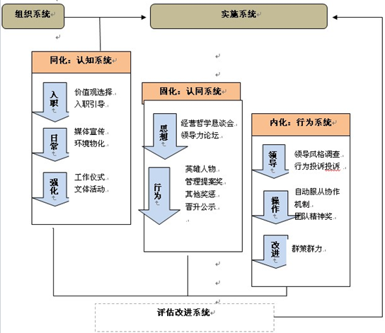 经营哲学落地是经营哲学实现的最终目标,经营哲学落地体系包括组织系统、实施系统和评估改进系统。具体见图4-8: