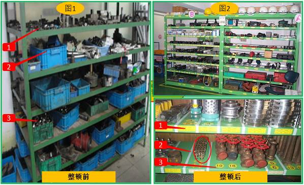 整顿后(图2)箭头2:物品有明确的存放位置,这样大家都知道存放在什么地方,谁来了都存放在这个地方,谁要用就去这个地方拿,不需要找来找去,提高了工作效率。我曾服务过的企业生产线停机,机修找一个备件和工具花10分钟才找到,导致生产停机时间长。