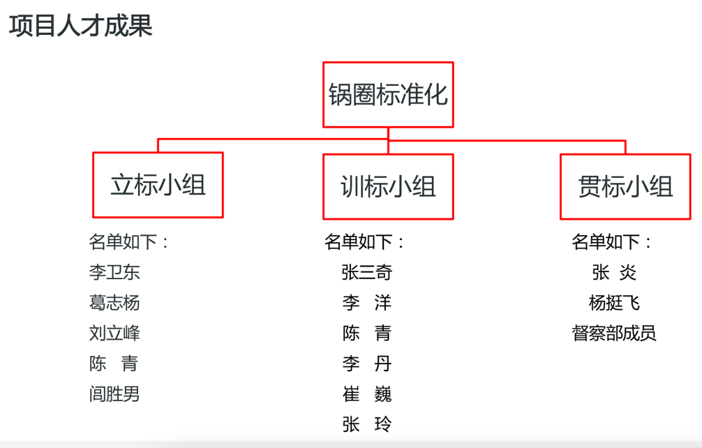 经过标准化项目的落实,锅圈标准化项目也成立了项目小组。设立了项目总监,项目经理以及项目组成员。又细分为立标小组、训标小组以及贯标小组: