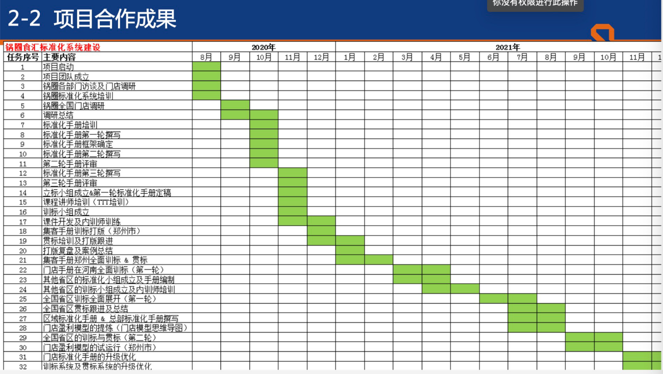 以及各省和全国门店以及开始进行贯标推进.把这个标准定为。全国性的标准进行输出。进行四项任命以及确认,第一项目成员任命,第二推进计划书制定。第三过程跟进辅导,第四项目成果确认.先后在各个省区进行辅导推进。从河南、河北、安徽、北京、陕西、深圳。进行辅助落地。成立指挥中心进行分级辅导,单兵+加单店模式。部分课程进行辅导分享。
