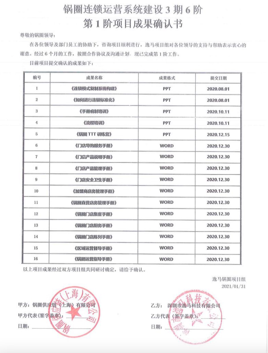 第一阶段的成果还有包括帮助企业制定的各种项目手册。其中包括区手册七本、《开业指导手册》、《运营督导手册》、《招商拓展手册》。《总部营销手册》、《训练手册》、《督查工作手册》、《运营指导手册》.门店手册八本。包括《产品管理手册》、《店务手册》、《产品手册》、《陈列手册》、《安全卫生手册》、《厨务手册,》《集客手册》,《导购手册》