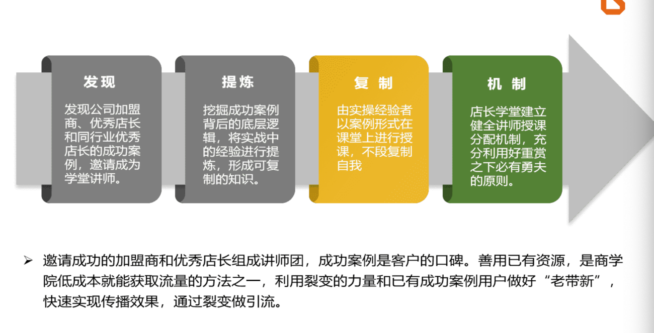 企业大学:运营指导思想的提炼、培训人才的开发、培训课件的制定、人才标准化与复制、训练与督导系统的建设.