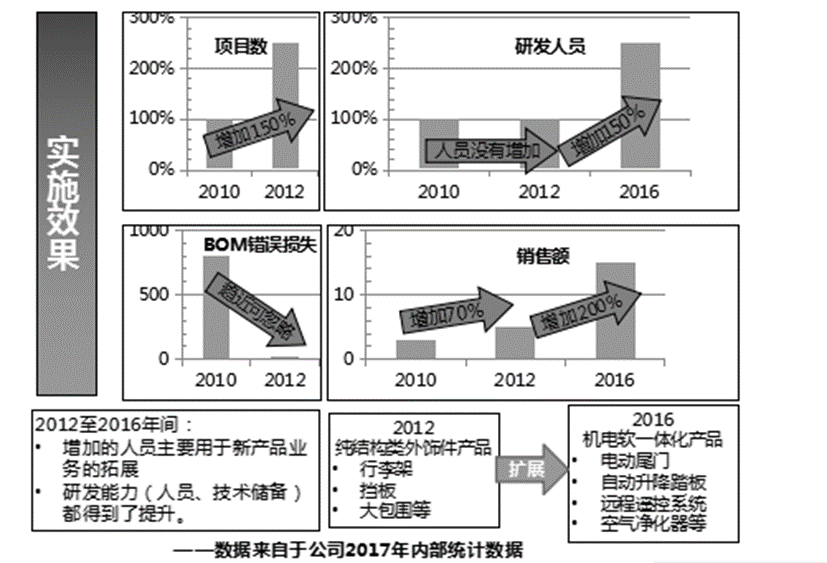该企业是国内首家集成IPD和PLM系统的实施项目,取得了预期效果,同时入选西门子全球PLM-STAR项目。项目实施收益如图5-10所示。