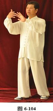 接上式,腰微拱,重心渐渐移至左腿,右手随重心转移向左下腹划弧捋至左肋旁。手心翻转向上,左手随腰拱,向外上方划弧翻转掌心向下,高与肩平,成左抱球状。右腰上提,右脚随即向前迈出小半步,右手臂上翻向前打掤(见图6-100至6-107)。
