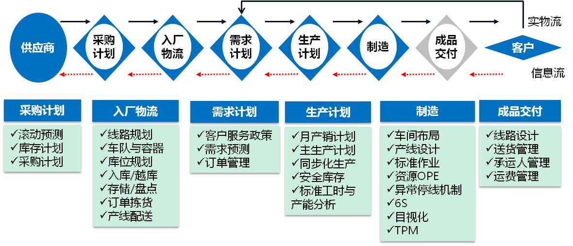 主要包括零部件入厂物流和仓库、制造配送物流、成品配送物流等,很多公司将零件物流内容与计划部归为一个部门,成品物流工作划归到销售部;另外一些部门将所有的物流工作划归到独立的物流部。