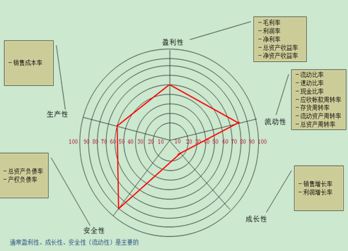 “五性”是通过比率(ratio)来实现对经营情况的评价,是经营数据分析中应用广泛的一项分析工具。“五性”即盈利性、流动性、成长性、安全性和生产性,这种从五个方面来评估企业经营业绩的方法。