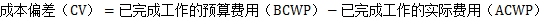 (2)成本偏差(CV):是指在检查的一段时期已完成的工作的预算费用(BCWP)和已完成工作的实际费用(ACWP)之间的差值,计算公式为: