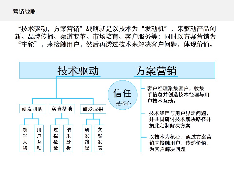 案例启示:方案营销必须以技术为先导,在营销体系与技术体系高度融合的基础上方可实施。方案营销应该遵循其自身逻辑,务必强调与用户的技术互动。互动越多,信任度就越高;用户的参与度越高,方案的精准性与可实施性就越强。