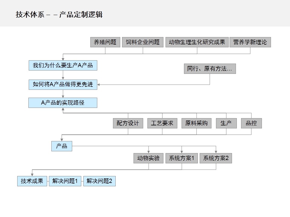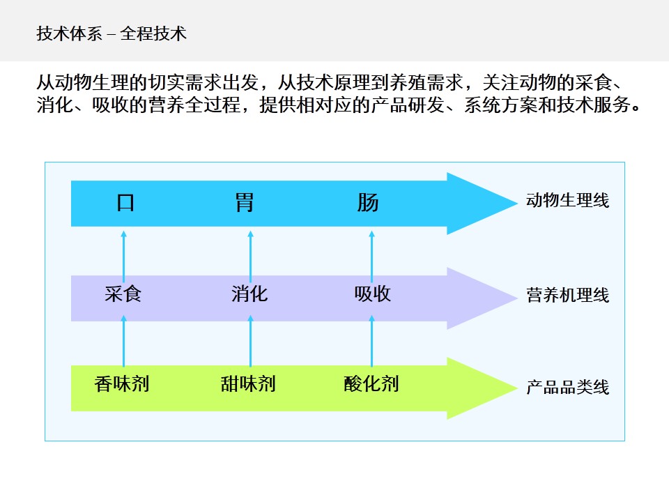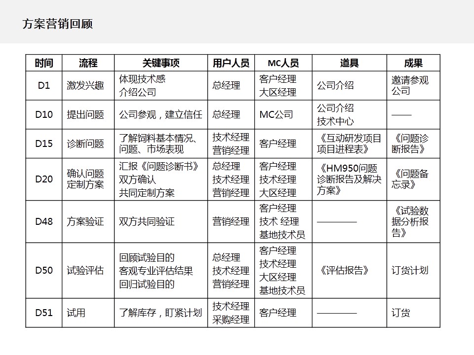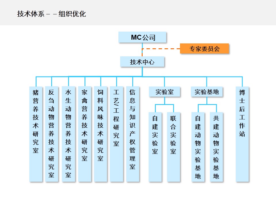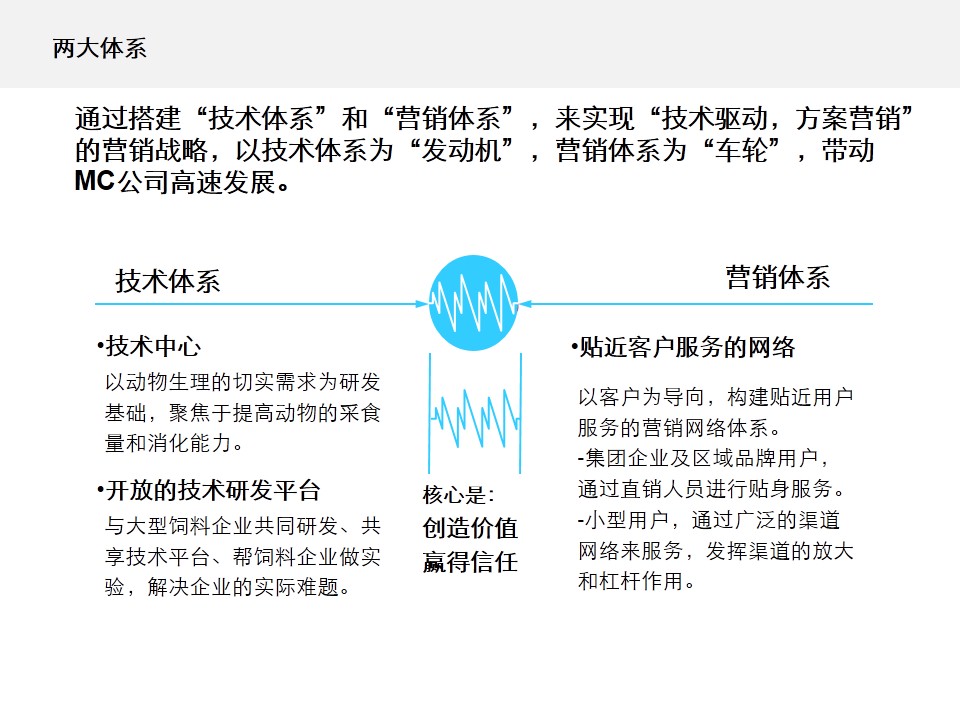 其实,MC公司本应该是一家技术公司,不应该表现为一个产品公司。唯有技术可以打破产品形成的天花板。进一步梳理了公司的发展历程、成功基因、业务机会、行业趋势等,我们确定了以“技术驱动价值”作为MC公司的核心诉求;将公司的愿景优化为:成为全球领先的动物营养技术公司;并着手实施“技术驱动,方案营销”的营销战略,打造“分品分种全程技术、分层分级立体服务”的营销模式。