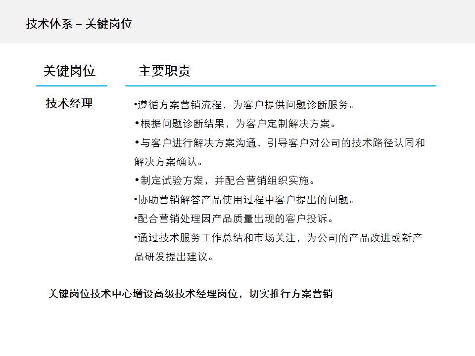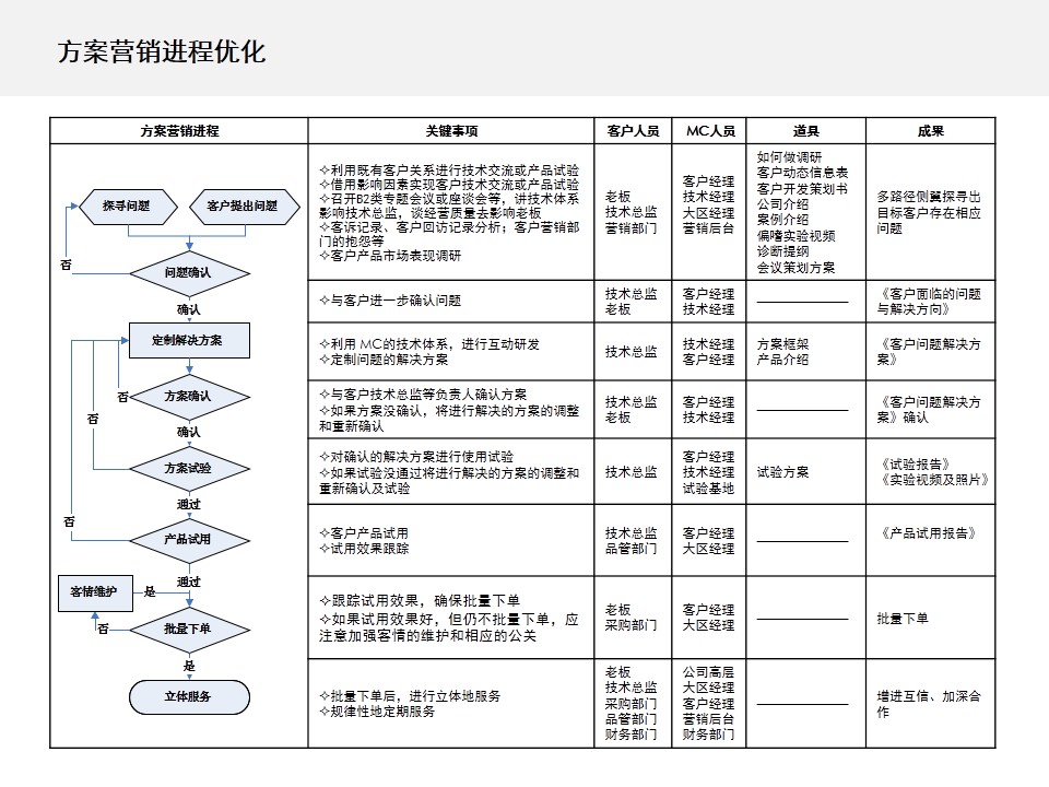 方案营销,实现了从单一产品销售,到提供解决方案;从与客户一对一的销售沟通,到面对一个复杂组织的立体交流;从被动售后服务到主动全程服务的转变。这些转变的实现,离不开一个高素质的营销团队和强大的公司后台支持。