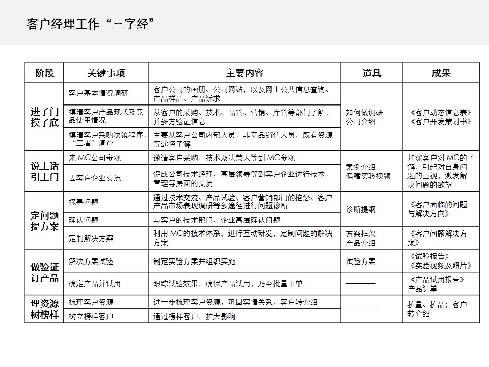 营销人员既要熟悉产品技术、了解行业知识,又要有商务沟通、项目管理、资源协调的能力。这些都要求营销人员有扎实的营销基本功,营销基本功可以按本书相关章节进行学习和训练。