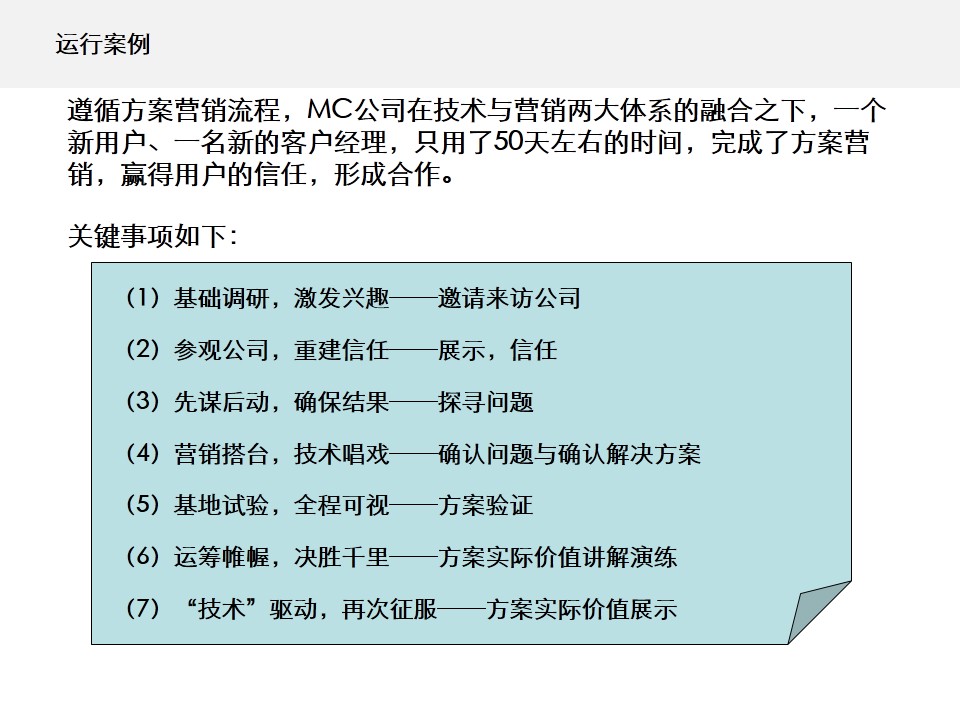 产品公司卖产品,技术公司卖方案。方案营销必须遵循其逻辑,从卖产品向卖方案转变,围绕“技术营销,营销技术”,运用技术体系聚焦用户实际问题,为用户提供“表达效果,彰显品质”的价值,MC公司为此开展了一系列工作: