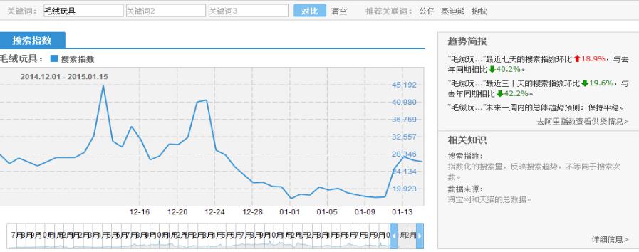 我们可以看到终端客户搜索的指数,可以看到其是下降还是上升。如果相对往年来说是下降的,那我们就没有必要再去做这款产品了,我们可以搜索一些新的产品试试!搜索指数里可以看到此产品3年的数据,据此可以制定自己的计划!