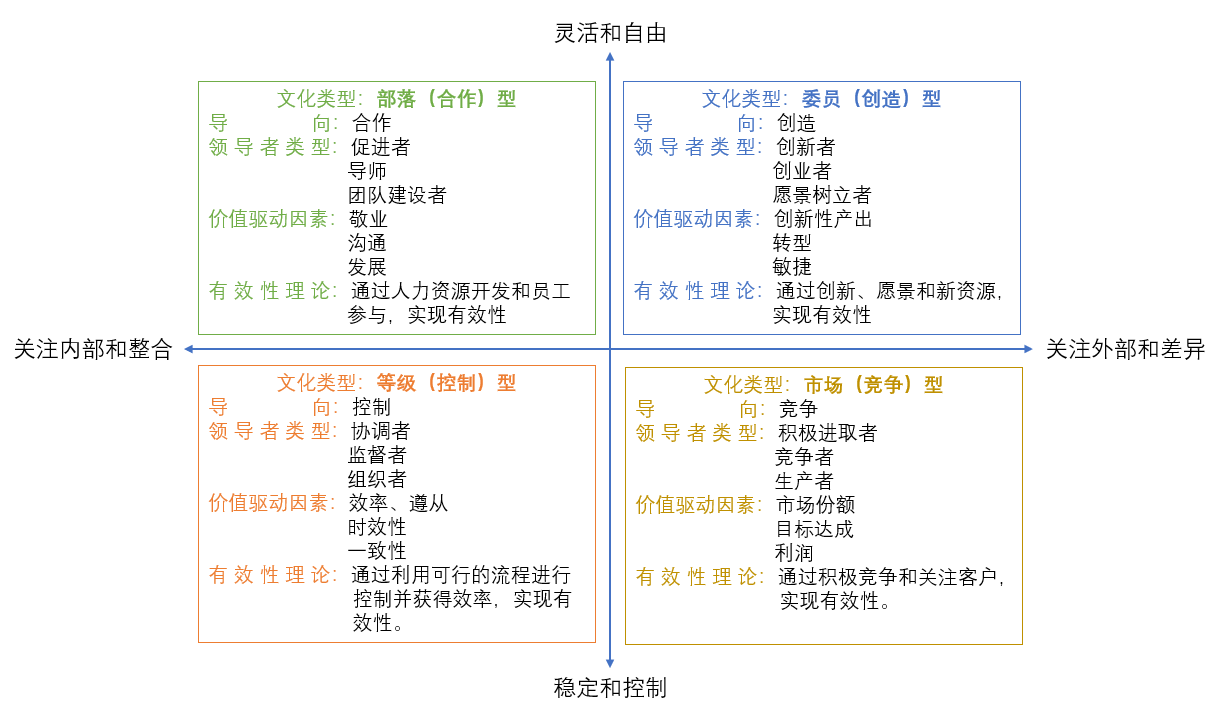 美国学者金·卡梅隆(Kim S·Cameron)与罗伯特·奎因(Robert E·Quinn)以组织有效性的两类维度(灵活&稳定、统一&竞争)分别做坐标,形成四种文化类型,分别是等级(控制)型文化、市场(竞争)型文化、部落(合作)型文化、委员(创造)型文化。