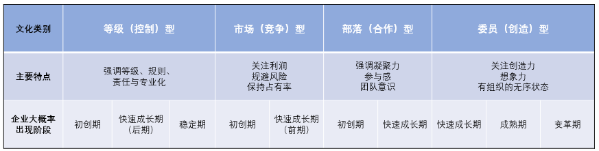 每一类企业文化,不但随企业发展阶段的不同而有所演变,而且因企业体制特点或创始人个人偏好不同,在不同发展阶段的企业,出现不同文化类型的概率也会不同。如表4-2所示。
