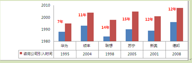 研究还发现,华为、联想、苏宁等标杆企业,经过3~5年的项目密集开展期后,在接触咨询公司5年后开始呈现出两个明显特征:一是项目开展个数开始下降;二是合作咨询公司的个数也下降。