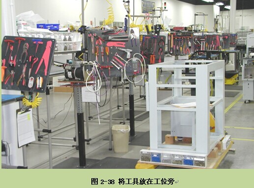 在工作台或机器上将工具一线排放使用,这是不正确的方式。因为工作人员在工作台上的动作范围及动线是呈圆弧状态,而非直线状态。一线排开不但有违前述的动作原理,而且使工作距离拉长。