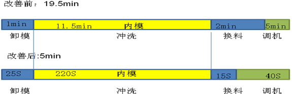 通过分析,找出了改善点。通过推进内部作业转外部作业,多人联合作业,将作业时间从19.5分钟压缩到5分钟。同时增加了每班的切换频次,降低了在制品库存。如图10-3所示。