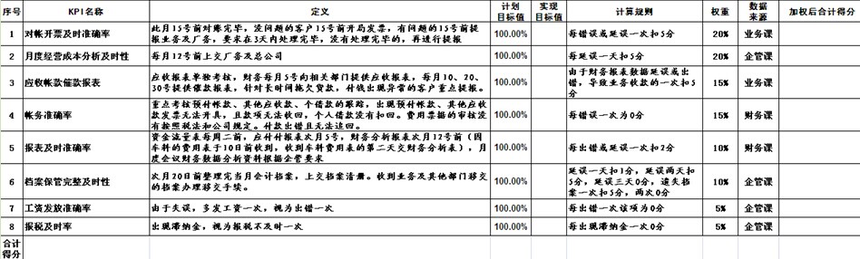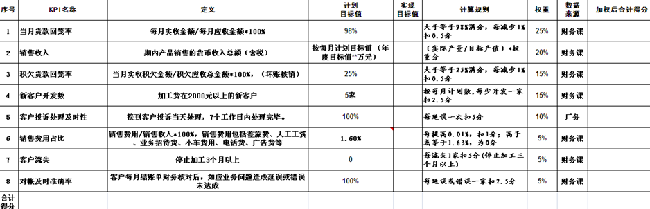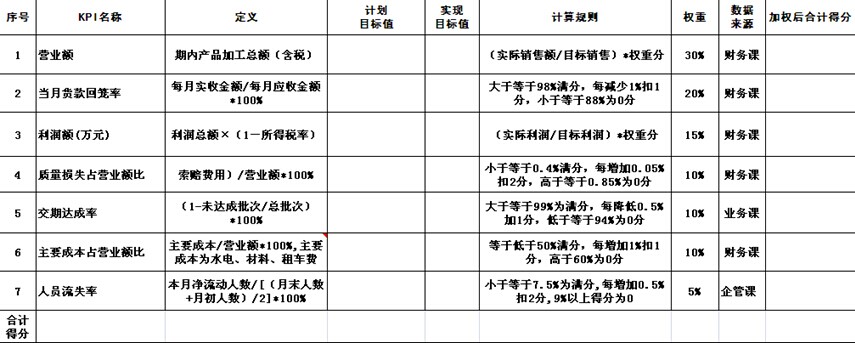 1绩效合同示例,有的绩效合同可以只用一张考核表囊括所有指标,具体如表9-6、表9-7、表9-8和表9-9所示。