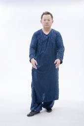 7.全身再度松沉一次,随着松沉往下的同时,双手顺势垂落。先交叉下落至丹田处,待双手指尖朝下后,手再向两旁卷开至两腿裤缝旁,掌心朝后。