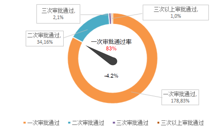 对201X年X月数据进行分析统计,我们了解到A公司销售合同一次审批通过率在83%,二次审批通过率16%,三次审批通过率1%,另有1个合同审批三次以上。