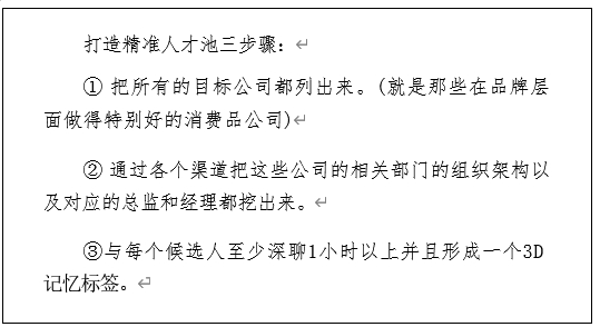 当你有了清晰的定位之后,你就可以更有方向性地落地了。比 如我的精准人才池就是消费品品牌总监,这就意味着无论客户是什 么行业,只要他需要消费品行业的那些拥有品牌经验的高阶人才, 我都可以帮他解决。那你怎么做到呢?定位之后,做三步动作。
