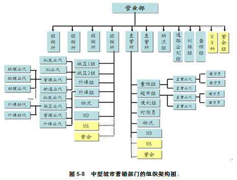 在上述组织架构中,营业所组织架构基本相同。经销所一般由城区组与外埠组组成,少数营业所还包括直营组。除营业组之外,营业所还配备所MD、所MS、物流与营会人员。城区组一般由管理业代、MA业代、批发业代、封闭通路业代与助理业代组成。外埠组除了管理业代、MA业代、批发业代、封闭通路业代与助理业代之外,还由外埠业代、驻区业代、外埠助代及车销助代负责外埠乡镇市场。经销所中的直营组一般由KA业代与封闭通路业代组成。