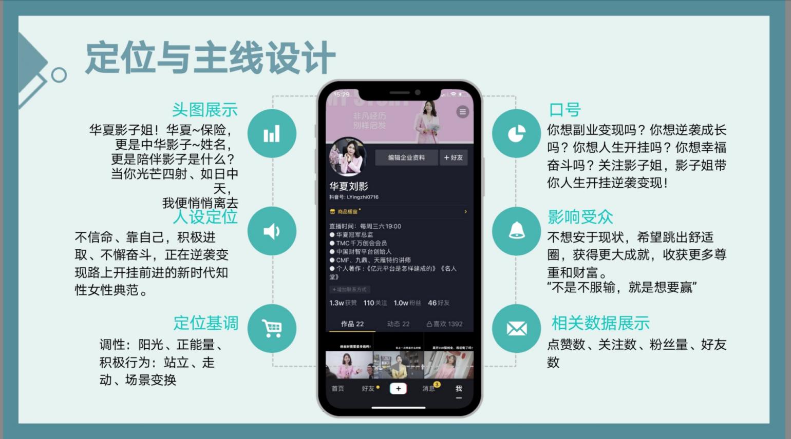 下面这案例是,我为一个好朋友、保险行业的大咖刘影设计的“抖音定位”:
