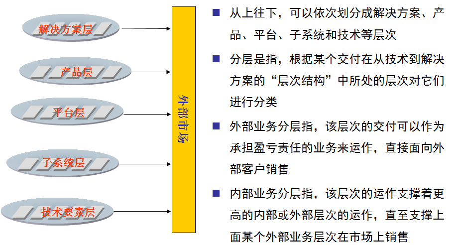 如下图,将公司业务分层管理,都面向市场,技术难度大的先行,最后统一时间点交付给客户。