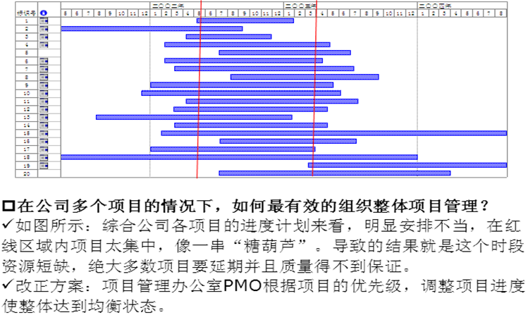 项目管理办公室要安排多个项目均匀地分布在管道中,不至于在某个时间点项目太集中、导致资源不够用,也不能在某个时间点项目太少,导致资源闲置。