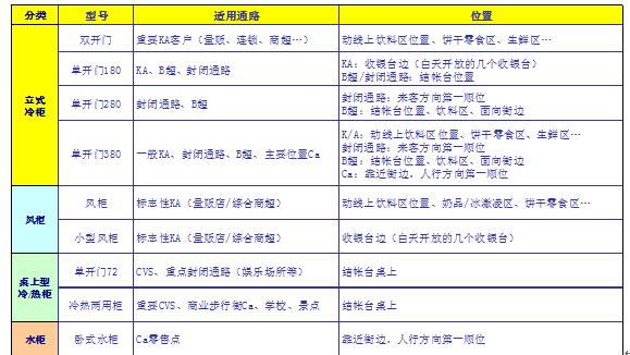 ① 位置选择:冰箱陈列应选择售点入口、扶梯口、收银区、食品区、冷藏食品区等人流量大的位置。