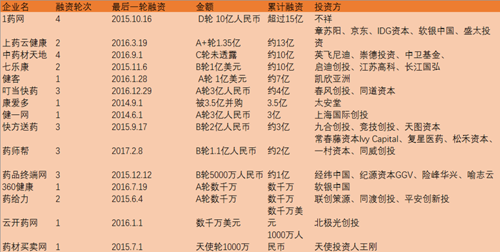 有披露融资信息的企业当中,目前1药网为融资领头羊,已累计获得超过15亿人民币融资。累计融资超过10亿的企业共有4家,分别是上药云健康、中药材天地、七乐康。七乐康于2017年2月15日公布新一轮融资信息,红杉资本、京东等多家机构参投,但未透露具体金额,故排名未变。