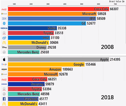 近10年,全球品牌价值前十的企业换了一半,排在前三名的企业全部易主。如图1-1所示。以苹果、谷歌、亚马逊为首的科技公司占据头部,和10年前品牌价值前三名之间小小的差距截然不同,2018年品牌价值前三名的差距非常大。这个时代的变化比以往来得更快一些,那么这个时代和以往的时代有什么不同呢?
