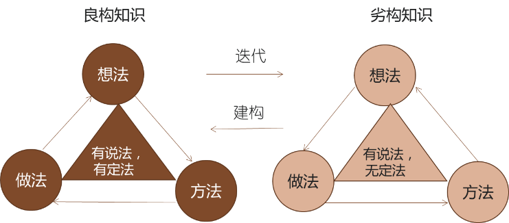 当我们想做什么事情的时候,如果有良构知识,直接学习相应的方法,去实践和应用即可,如国家法律、法规、技术规范就属于知识;如果没有良构知识,只有劣构知识,便需要将其加工整理成结构良好的知识,这样更有利于传承,如易然行出品的商业智能领导力云端修炼沙盘的开发方法就属于劣构知识,目前云端沙盘学习产品上线,但没有整理成方法论,这便属于劣构知识。如图2-2所示。
