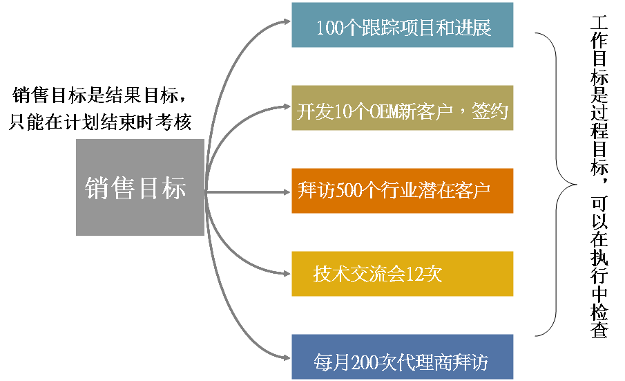 销售目标是结果目标,只能在计划结束时考核。因此,必须把销售目标分解成工作目标,工作目标是过程目标,可以在执行中检查。正确的做法是:除了销售目标分解外,还要把销量目标分解为工作目标,然后把工作目标下达给业务员。例如每天客户拜访的次数、解决方案提交的次数、几场技术交流会、客户来工厂参观和参加投标次数等。这些指标是销售管理者可以在过程中检查并及时地纠偏、指导的,不必等到最后一刻才行动,那时往往为时已晚。当然,对长周期的复杂产品销售或者项目型销售,行动的目的是为了促进销售流程向下一个里程碑前进,而不是拜访次数;而持续订单的大客户模式,业绩其实跟客户拜访量、拜访的质量、成功率有关。