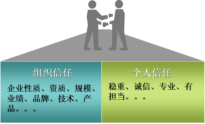 有组织的信任,还有客户对你个人的信任(见组织信任和个人信任图),你能否兑现个人承诺?你是一个稳重有担当的人吗?还有你的专业性,当客户表示担忧的时候,你不能只是拍胸脯,必须了解客户的担忧,除了了解客户的顾虑,你还得有有效的计划和方案、保障措施,用专业性让客户打消顾虑。