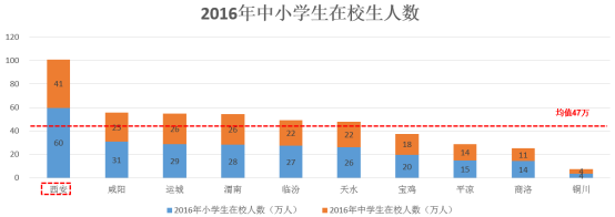 从小学生2016年在校生人数看,关中城市群2016年小学生在校人数为253万人,占全国小学生在校人数9913万人的2.6%,远低于城市群占全国总人口比重11%的水平;关中城市群10个城市小学生在校生人数总涨幅为-4%;重点关注城市西安、天水、渭南。