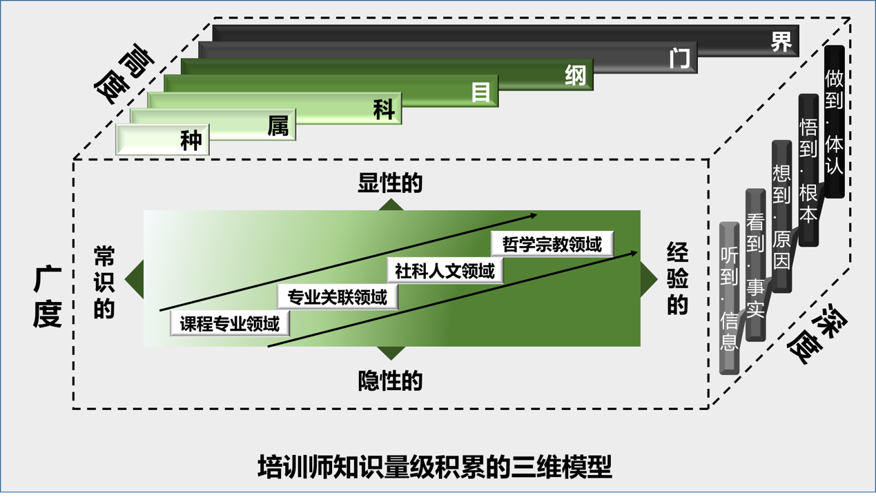 由听到信息进而看到事实,再想到原因,再悟到根本,直至做到体认——对于培训师来说,经由对知识的深度探索,不但可以有自己的深刻体认,从而让学员产生信服感,更可以有效地引导学员进入自主思考,从而促进行为的改善。