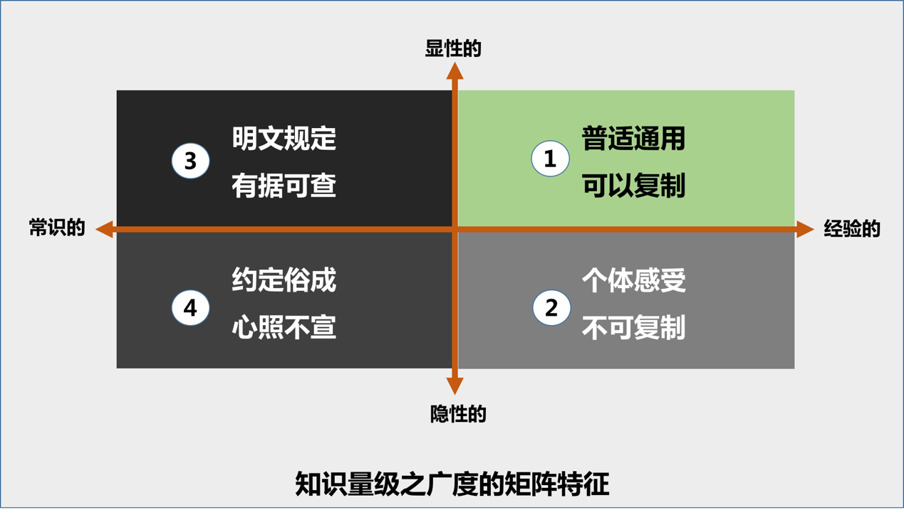 广度指的是知识领域上既同步又阶梯的、持续的扩展。其中的课程专业领域以及专业关联领域更侧重在知识的器用(即技术和方法)层面,而社科人文和哲学宗教领域更侧重在器用层面基础上的道用(既思维模式、价值理念等)层面。与此同时,知识广度的积累还需要注意次一级的四个维度,即显性的、隐性的、常识的、经验的,分别会有图8-6的一些基本特征。
