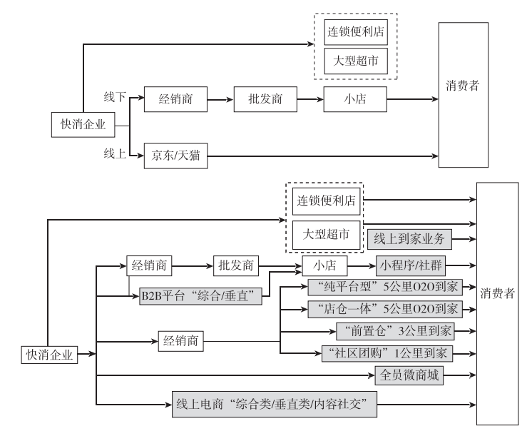 越是高线城市,现代渠道占比更大!渠道组合更加多元化,新兴渠道越多越活跃;越是低线城市,传统渠道占比更大!渠道组合相对简单,新兴渠道越少不活跃。