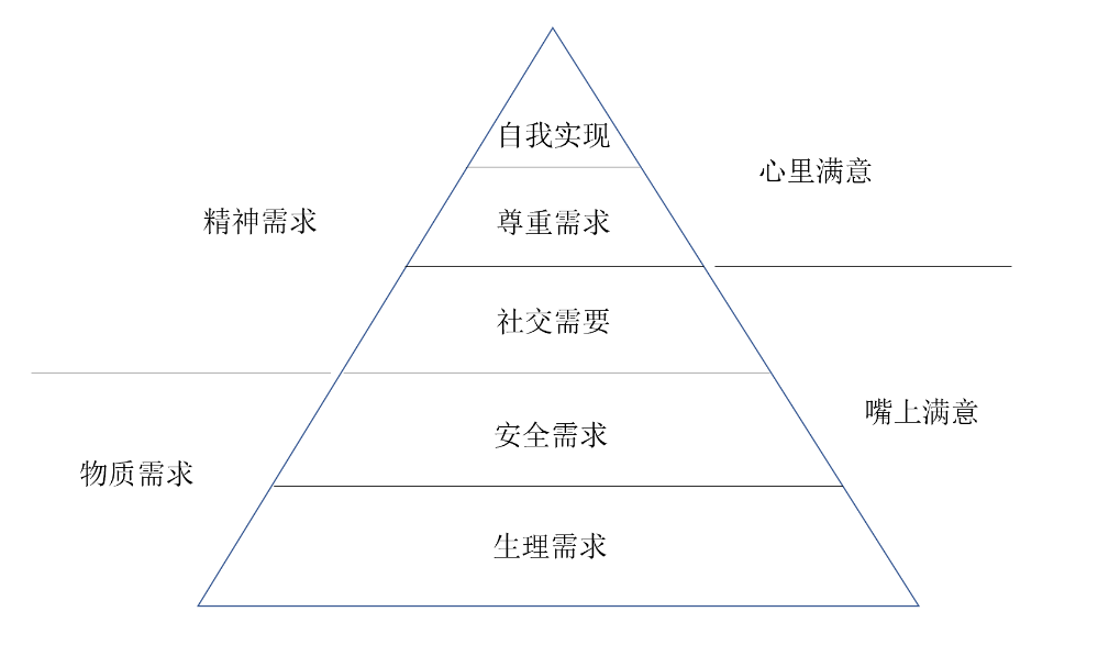 如图8-4所示,物质需要为安全和生理需求;精神需求为社交、尊重和自我实现需求。一般客人在嘴上满意的多为物质需求得到满足,心里满意更多是精神需求得到了满足。